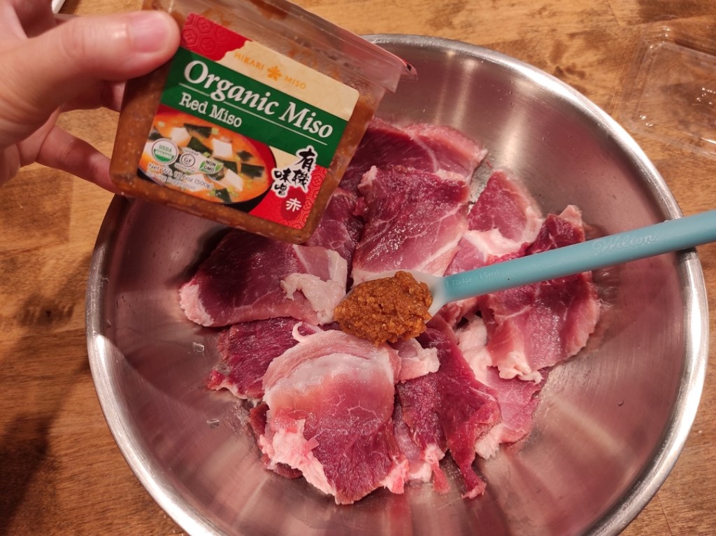 Preheat the oven to 415 Fahrenheit. Cut the pork shoulder roast to thin slices. Add Miso.