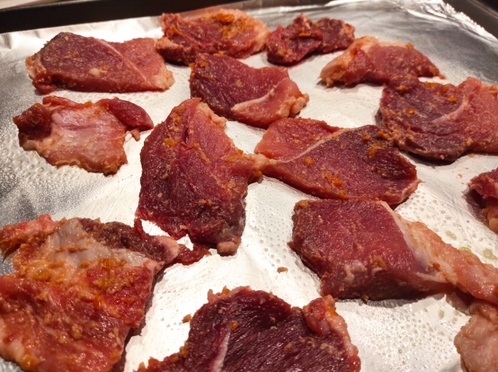 Get a baking tray covered with foil. Spray some oil on the foil. Lay the meat on the baking tray.