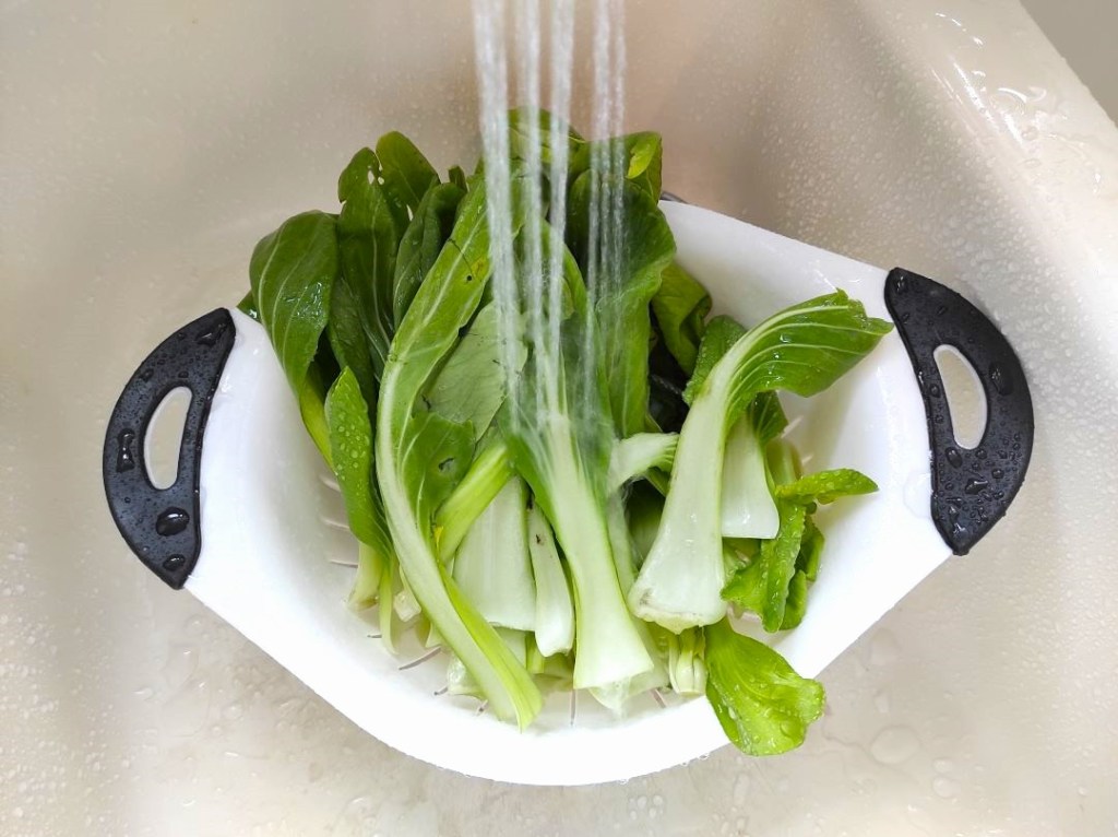 Cut off the bottom of bok choy. Rinse the bok choy.