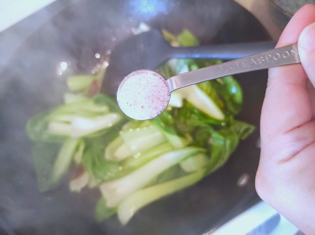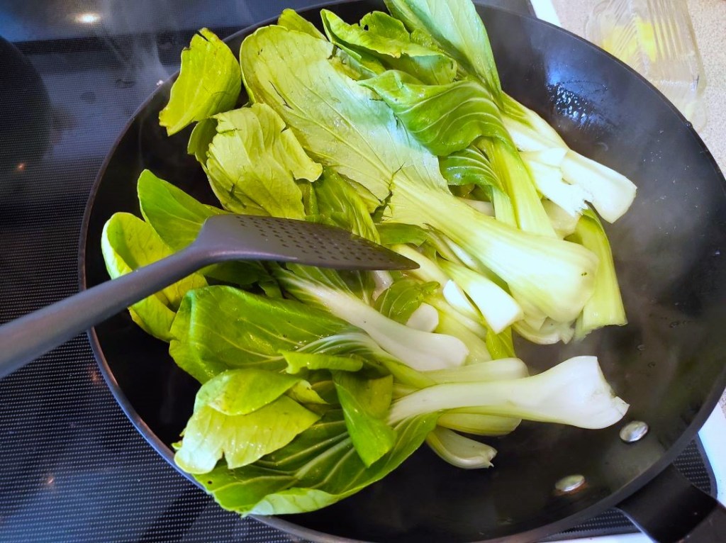 Add bok choy to the wok. Stir to make sure the bok choy doesn’t get burnt on the bottom of the wok. Add salt and keep stir. Cook till the white stem of bok choy gets tender. Enjoy.
