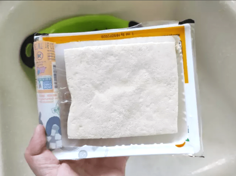 Open the tofu and drain the water. Cut the tofu into long and flat pieces.