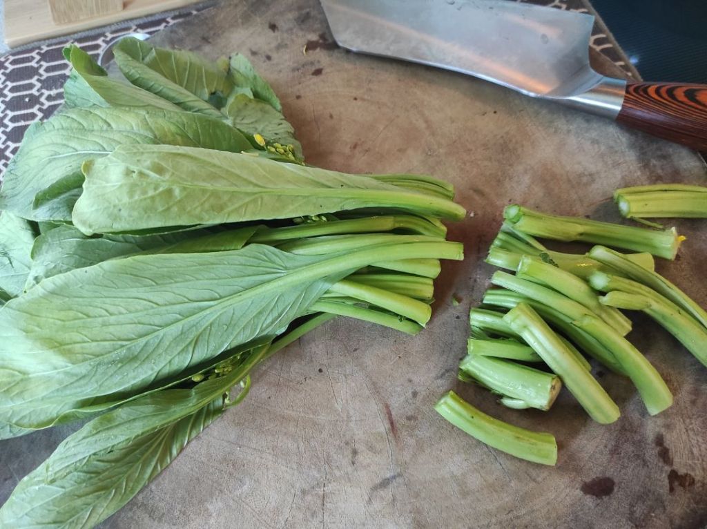 Start with a pot of water for boiling. The water should be enough to cover the u choy sum. Add some oil to the water. Meanwhile, chop off the stems of u choy sum.