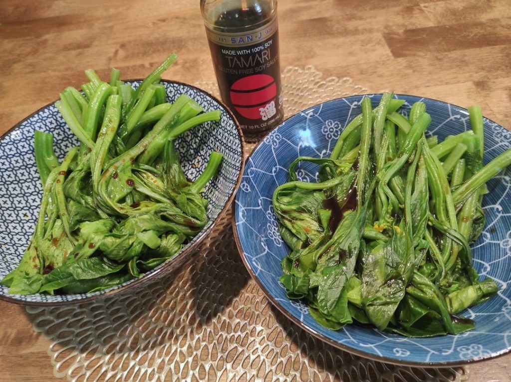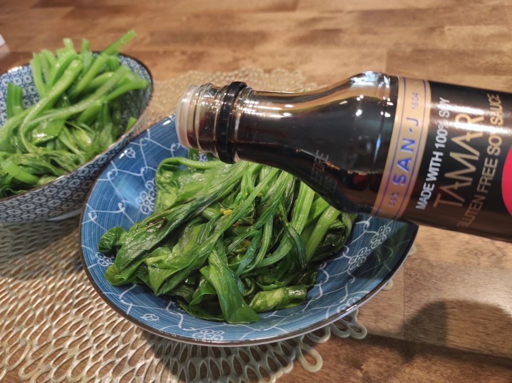 Pour decent amount of soy sauce all over u choy sum. 「Tips – Chinese light soy sauce, Japanese all purpose soy sauce or tamari gluten free soy sauce is good. Don’t use flavored or dark soy sauce for this dish.」