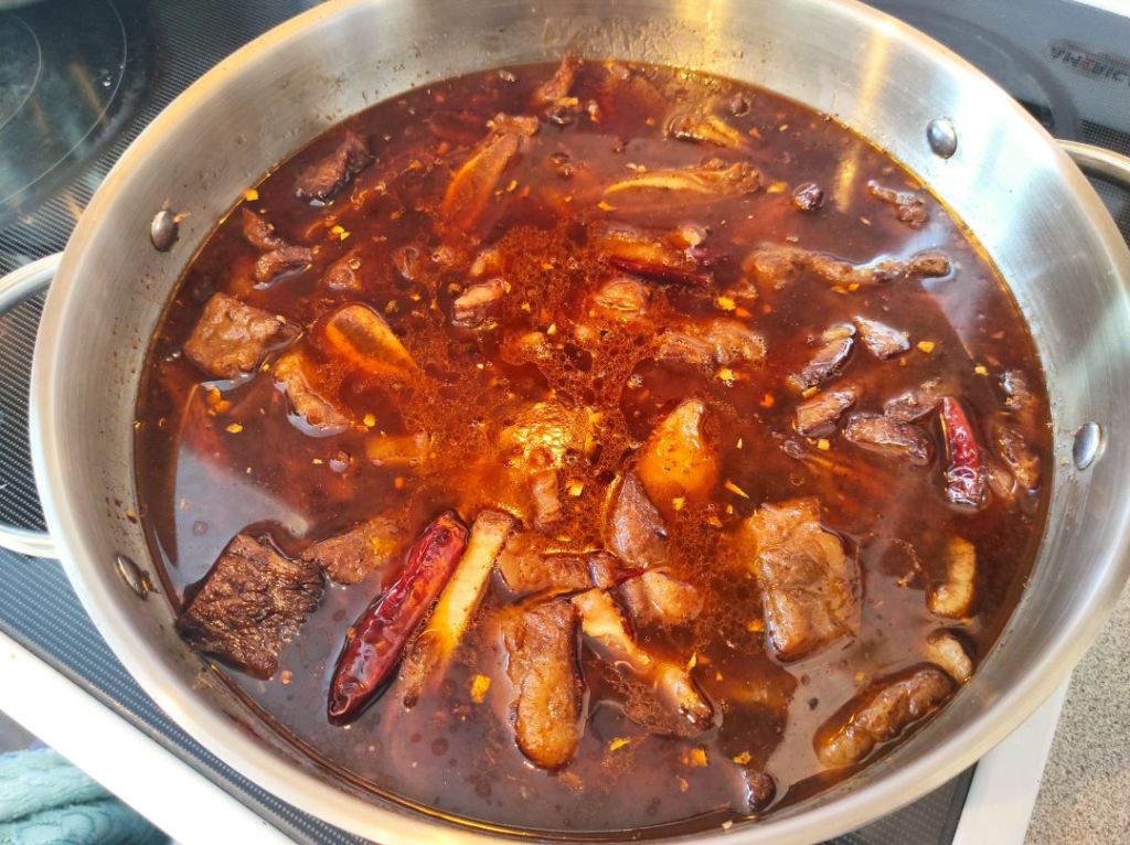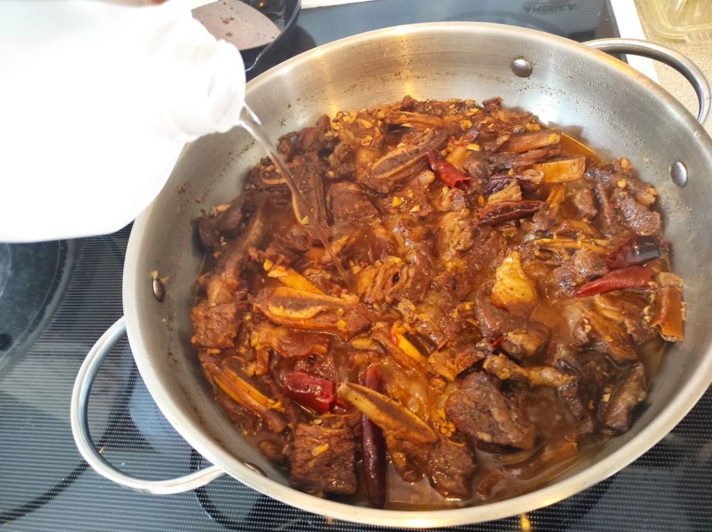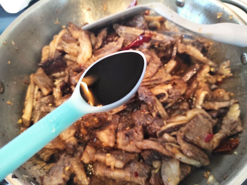 Add broad bean chili oil sauce. (Try to get the red oil part of the sauce. Because the slow cooking process will make the beef absorb all the flavor from sauce. Just a little bit of sauce will make it spicy and savory enough. So avoid too much sauce.)