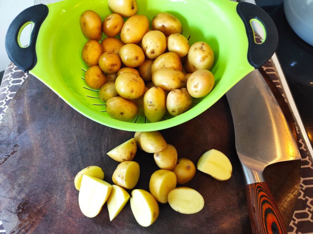 Cut the baby potatoes to half size while beef is boiling. After 40 minutes to 1 hour, the water in the pot should be shallow. Add water to cover the beef again.
