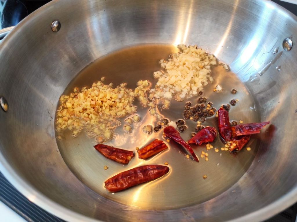 Heat the oil at high heat. Add ginger, garlic, dry red pepper and Sichuan pepper corn. Before the garlic turns brown, add beef.