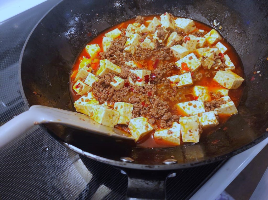 After the water is boiling, add tofu. Gently(tofu is fragile) stir, flip and mix the tofu with the beef. Then let the tofu and beef boil for 3 minutes.